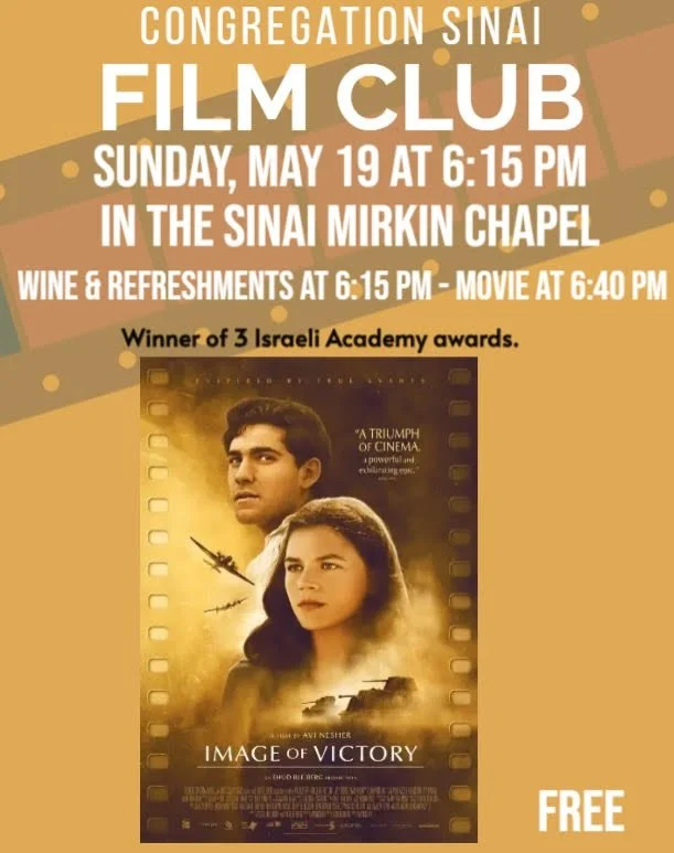 Film Club at Sinai "Image of Victory": Sunday, May 19, 6:15 pm in the Mirkin Chapel. Join Sinai members and friends at the screening of Avi Nesher's award- winning film, Image of Victory. The film won 3 Israeli Academy awards. Doors open at 6:15 pm. Movie starts at 6:40 pm promptly, followed by an informal post-movie discussion. Free. Beer, wine, and refreshments provided. For more information, contact the film club team Lia Landau, Ilana Westerman, and Hal Hubis at filmclub@sinai-sj.org.