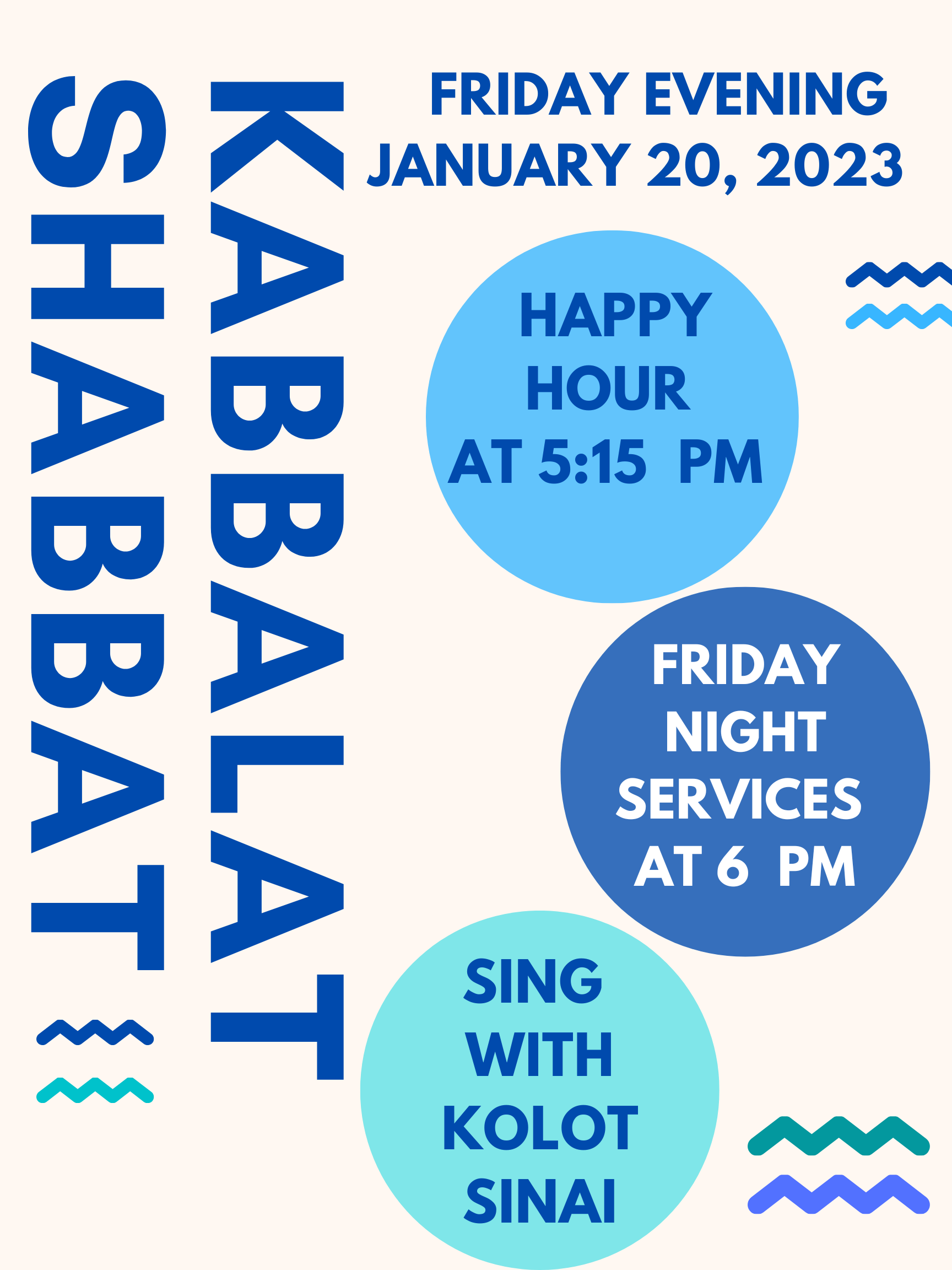 Join the Sinai community this Friday evening at 5:15 pm for Happy Hour followed by Friday evening services at 6 pm. Nosh on hors d'oeuvres and enjoy wine and beer, as well as kid-friendly beverages. Mingle with fellow congregants, then stay for a musical Kabbalat Shabbat service led by Rabbi Berkenwald and Kolot Sinai.