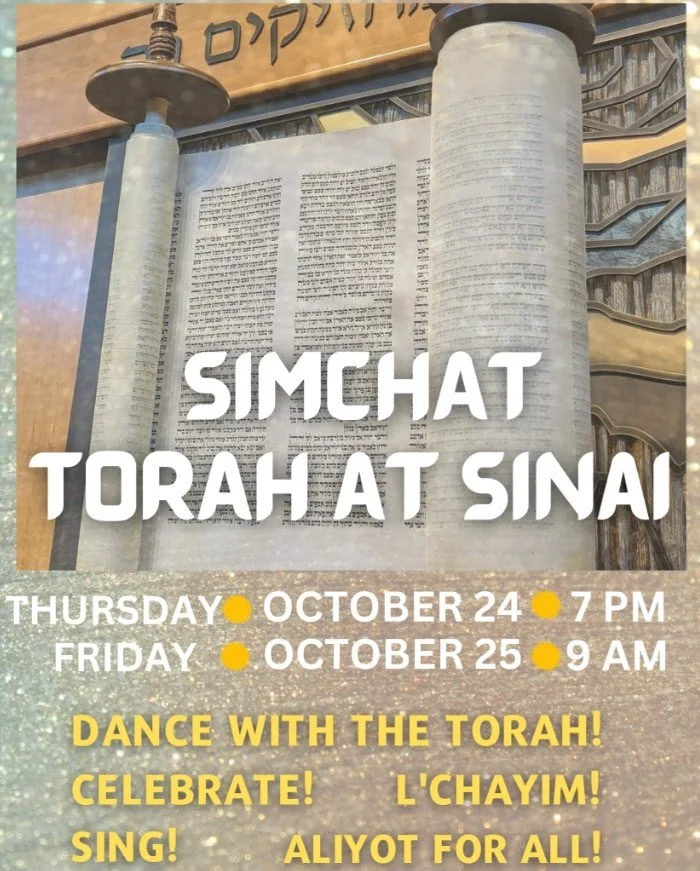 Leil Simchat Torah Evening Services: Thursday, October 24 at 7 pm. On the Hebrew calendar of the first anniversary of the 10/7 massacre, we will remember and we will dance again. Spend an evening rejoicing with the Torah as we sing 7 Hakafot ("circumambulations"). All ages welcome. L'chayim.