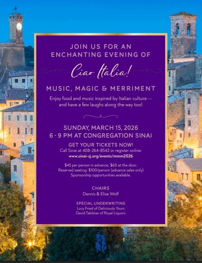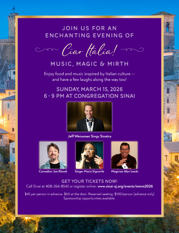 Get your tickets now! $45 per person in advance. $60 at the door. Reserved seating $100 with advanced reservations only. Call Sinai at 408-264-8542 or register online: www.sinai-sj.org/orders/mmm2026