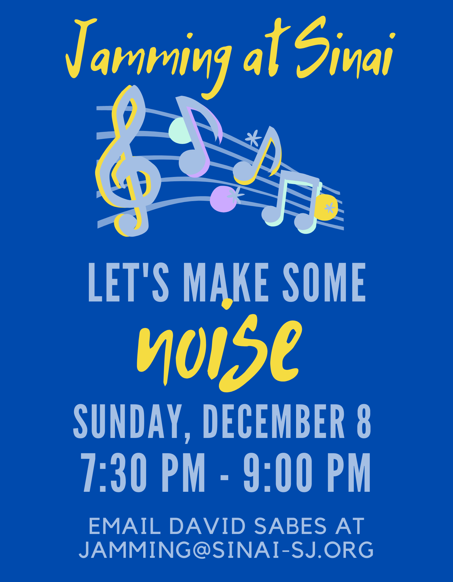 Sinai Music Jamming Group: Sunday, December 8 from 7:30 pm - 10:00 pm in the Social Hall. Be a part of Sinai's Music Jamming Group. Know how to play a musical instrument? Come ready to have fun and jam together. Singers also welcome to join. Interested? Please contact group leader David Sabes at jamming@sinai-sj.org.