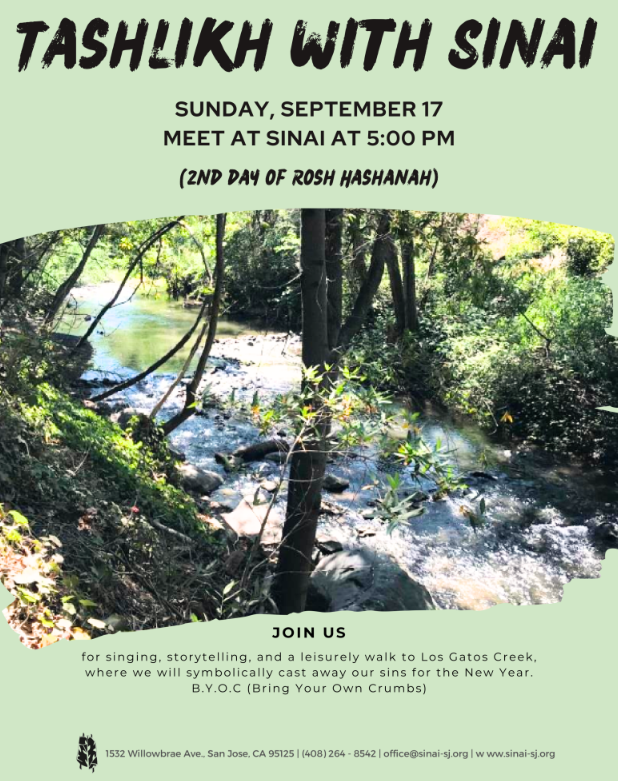 Meet at Congregation Sinai. Our Tashlikh ceremony takes place on the second day of Rosh Hashanah to observe the Jewish tradition of throwing breadcrumbs into the water to symbolically cast away our sins for the New Year.