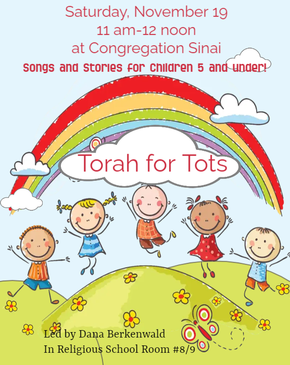 Torah for Tots Saturday, November 19, 2022 11:00 AM 12:00 PM 11:00 12:00 Congregation Sinai 1532 Willowbrae Avenue San Jose, CA, 95125 United States (map) Google Calendar ICS Join Dana Berkenwald for Song and Stories in Religious School Classroom 8/9. For children 5 and under with their grownups.